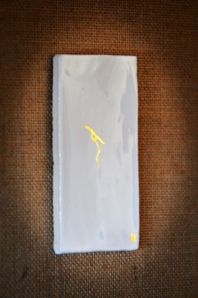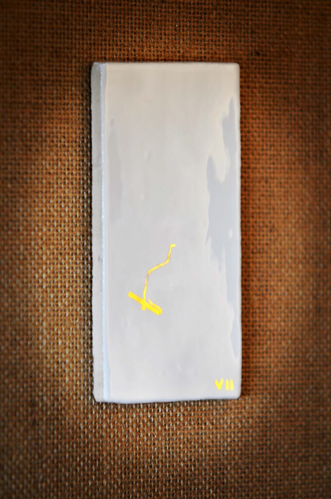 En segundo lugar, la técnica empleada este año para plasmar las imágenes es la de pintura de oro sobre baldosa cerámica, habiendo contado para ello con la colaboración de la ceramista CuandoEllaTocaElPiano. Tomando como inspiración a Kandinsky y, una vez más, los dibujos sobre cerámica de Álvaro Siza en la Capilla de los Huesos de Évora, fromthetree ha tratado de depurar al máximo la línea, despojándola de todo elemento superfluo y tratando de remarcar al máximo la tensión vertical de las figuras.