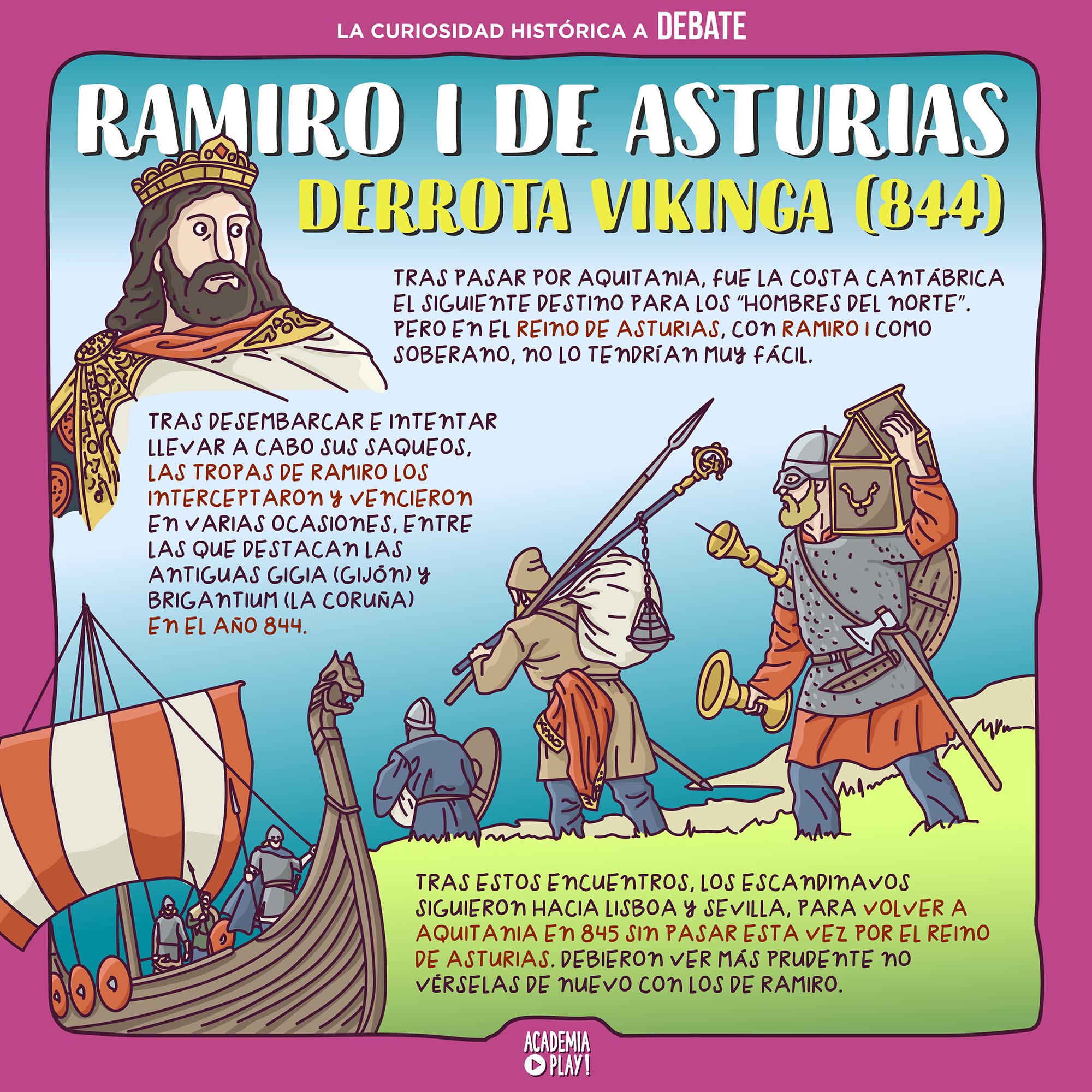 En el año 844 los barcos vikingos llegaron a lo que hoy se conoce como A Coruña. Pensando en una rápida victoria frente a una población desprotegida, se vieron sobrepasados por las tropas del precavido rey asturiano.